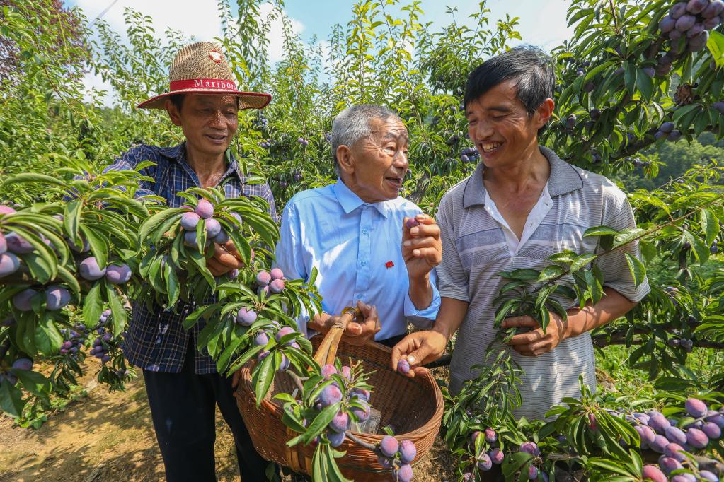 黄大发(中)和果农们研究水果种植技术(2018年8月12日摄)。新华社记者刘续摄