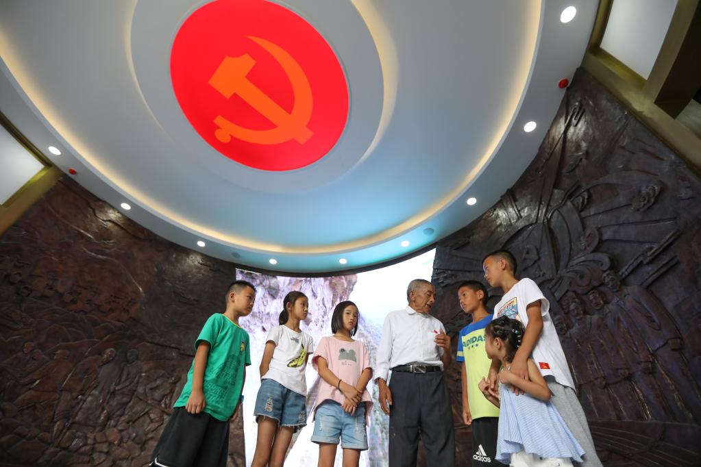 在“大发渠党性教育陈列馆”,黄大发向前来参观的孩子们讲述当年的故事(2018年8月11日摄)。新华社记者刘续摄