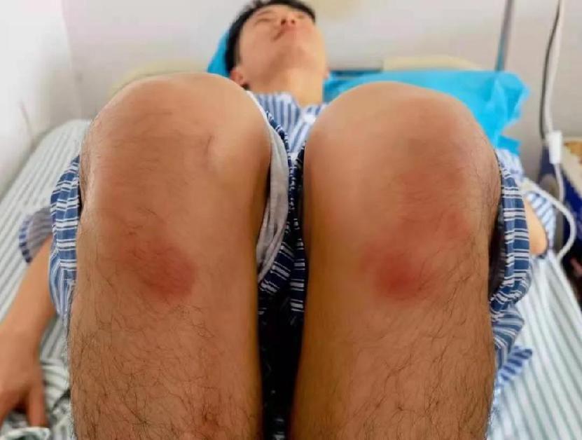 由于腰部受伤,李英豪被送往医院治疗。长时间跪地,李英豪膝盖出现大面积红肿。来源:受访者供图
