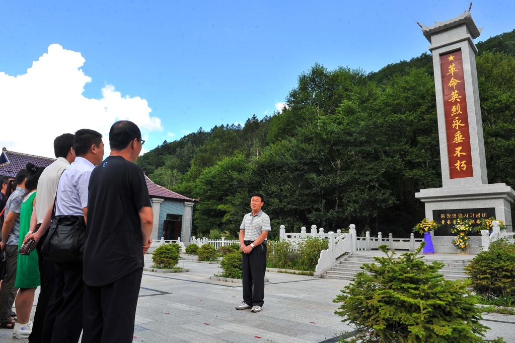 金春燮在汪清县东满抗日英烈纪念碑前瞻仰(2015年7月20日摄)。新华社记者林宏摄