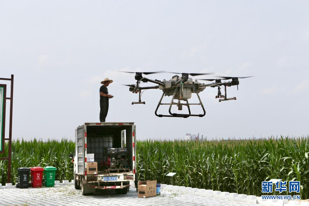 在吉林省四平市梨树镇,农技人员使用无人机对玉米田进行植保作业(7月29日摄)。新华社记者 耿馨宁 摄