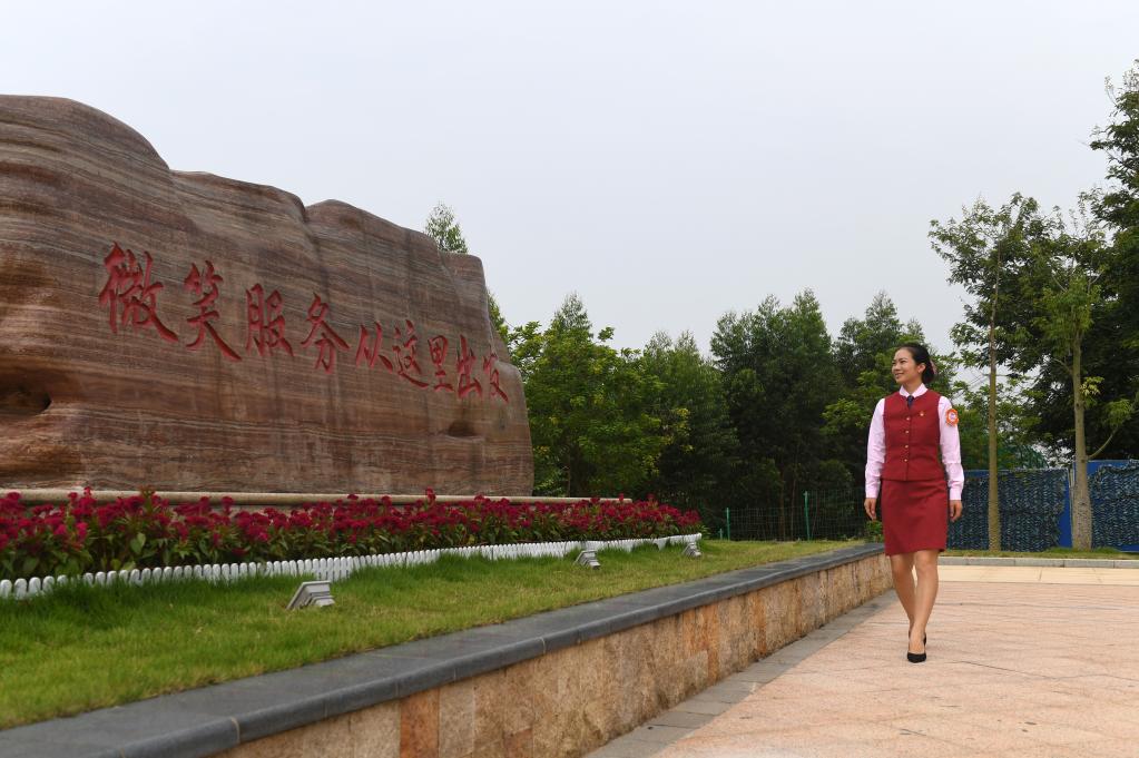 在广西交通投资集团南宁高速公路运营有限公司南宁东收费站,农凤娟从办公楼外一块刻有“微笑服务从这里出发”的巨石前走过(8月6日摄)。新华社记者陆波岸摄