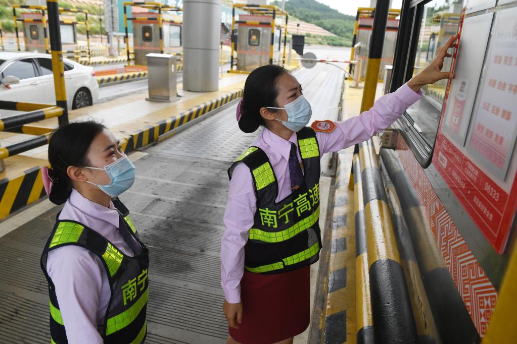 在广西交通投资集团南宁高速公路运营有限公司南宁东收费站,农凤娟(右)在检查有关服务提示张贴情况(8月6日摄)。新华社记者陆波岸摄