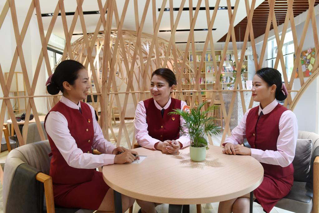 在广西交通投资集团南宁高速公路运营有限公司南宁东收费站职工书屋,农凤娟(左一)在和同事谈心(8月5日摄)。新华社记者陆波岸摄