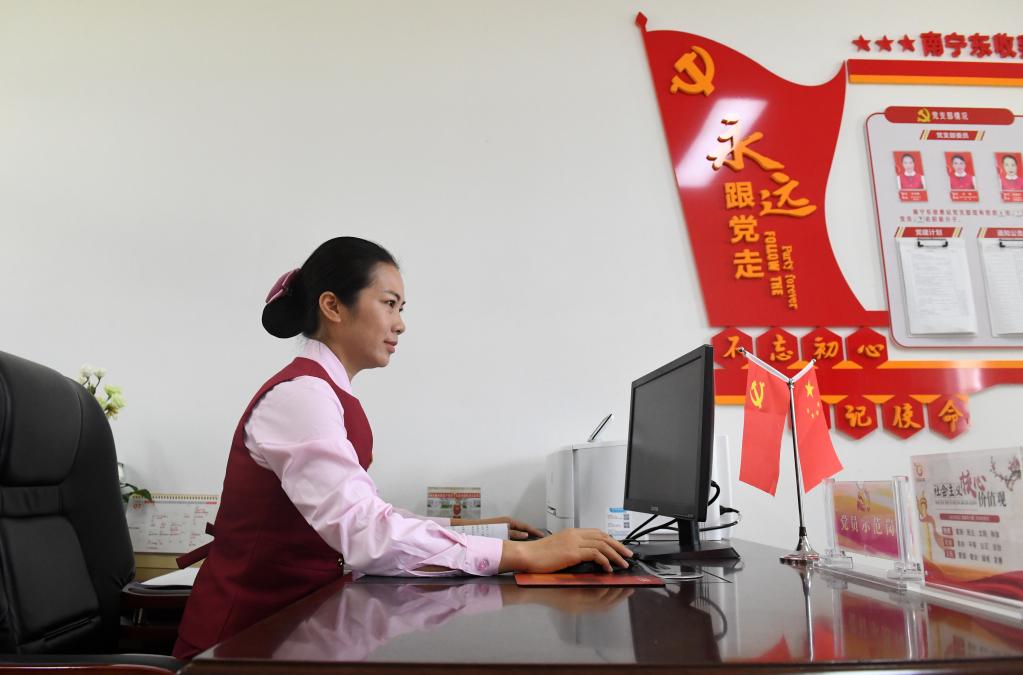 在广西交通投资集团南宁高速公路运营有限公司南宁东收费站办公室,农凤娟正在办公(8月6日摄)。新华社记者陆波岸摄