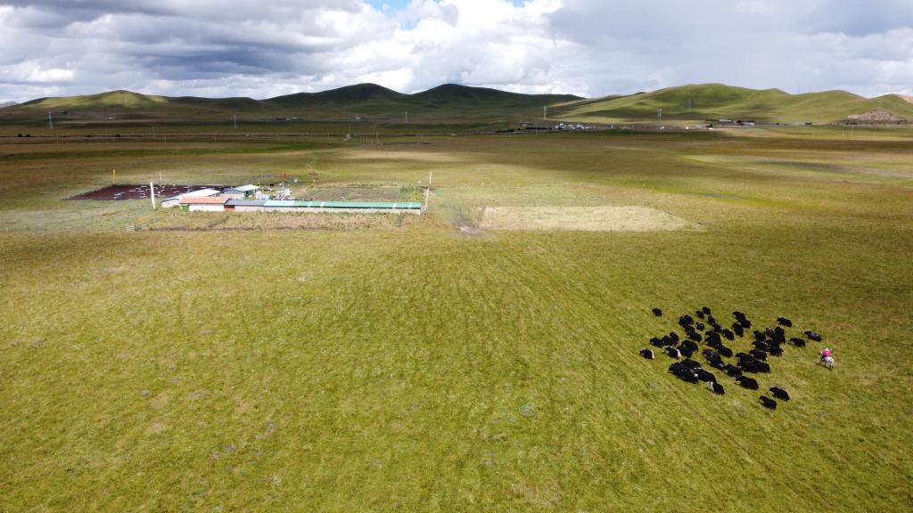 8月16日,在若尔盖县唐克镇,牧民将牦牛赶回圈舍。(无人机照片)新华社记者 尹恒 摄