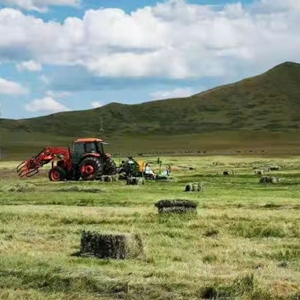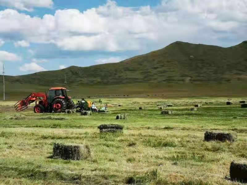 红原县瓦切乡的人工草场上,“牧草服务队”用割草打捆机收割牧草,为牲畜过冬储备草料。(新华社发)