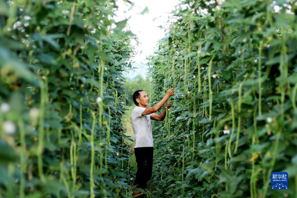 8月23日,湖南省涟源市桥头河镇侯胜村农民在采摘豆角。