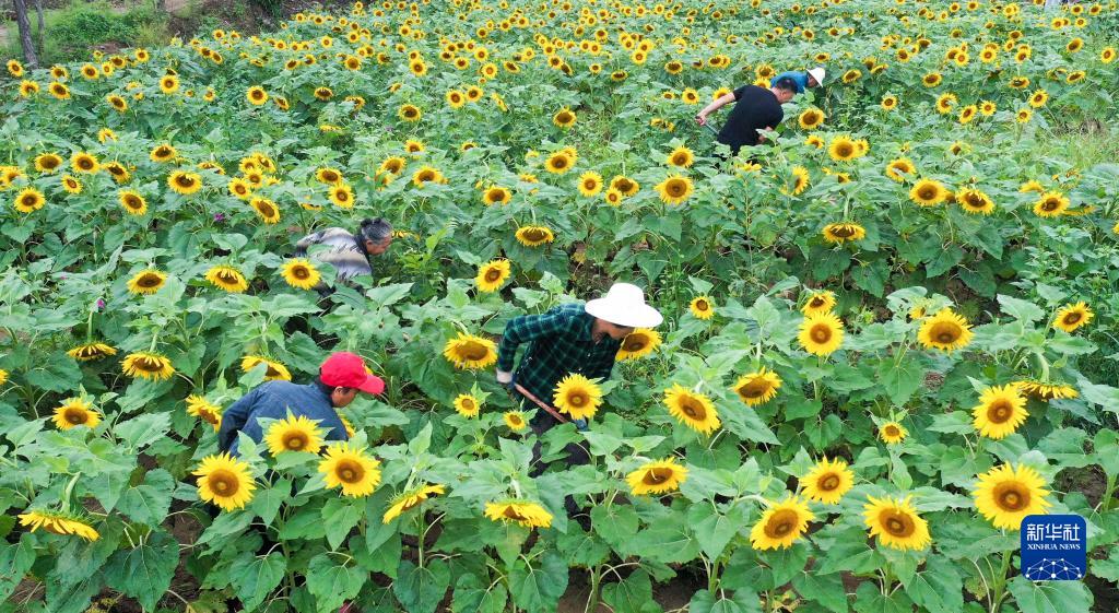 8月23日,河北省唐山遵化市建明镇鸿鸭屯村的农民在向日葵田间锄草(无人机照片)。