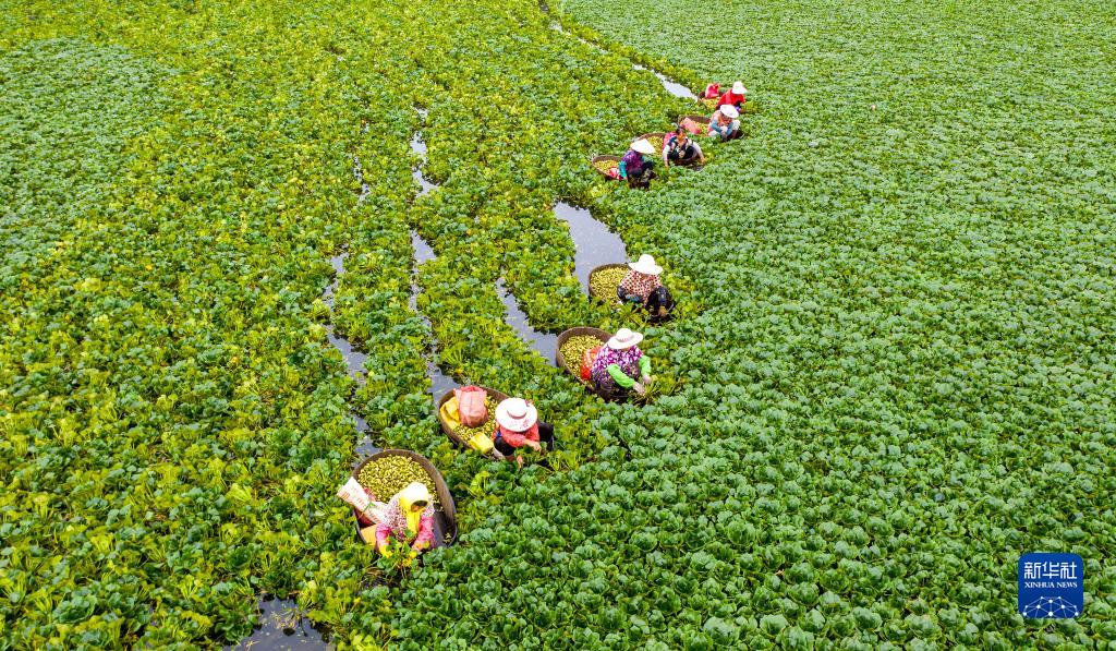 8月23日,江苏省海安市白甸镇周垛村村民在采摘菱角(无人机照片)。