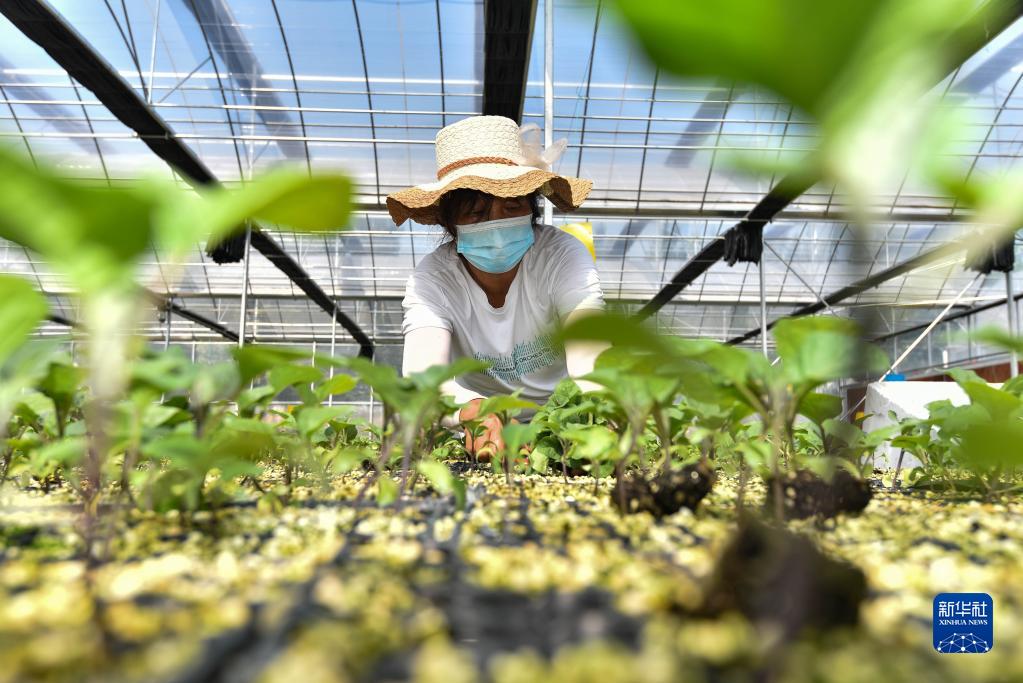 8月23日,农民在山东省青州市高柳镇一处育苗基地大棚内管理茄子苗。