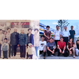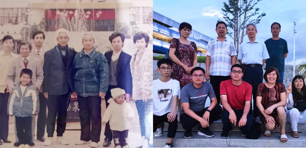2021年7月,北大在读博士台生兄弟林彦辰与林冠廷,追随爷爷林文芳三十年前的脚印,前往福建莆田探望未曾谋面的大陆亲人。左图为20世纪80年代末林文芳回大陆探亲,与大陆亲人重逢。右图为兄弟二人2021年7月与大陆亲人的合影。