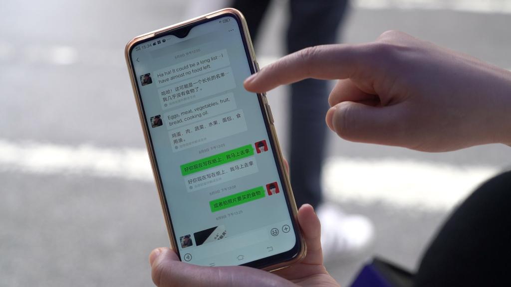 8月24日,社区工作者展示小区封闭管理期间为购买生活物资,和一名英国居民的聊天记录。(新华社记者 方亚东 摄)