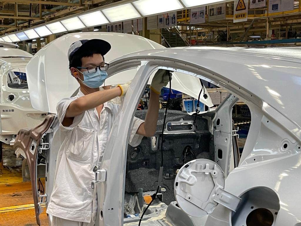 8月24日,东风本田第一工厂内一片繁忙,技术工人正在流水线上检查车辆。(新华社记者 王自宸 摄)