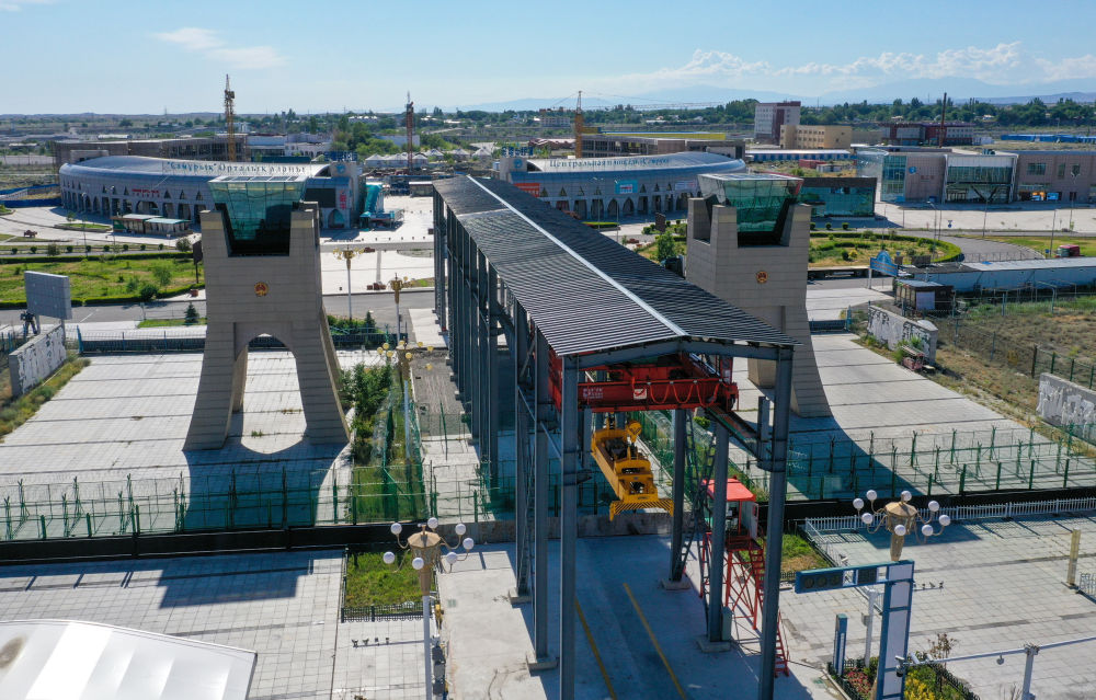 出境中欧(中亚)班列停靠在新疆阿拉山口站内(5月27日摄,无人机照片)。新华社发(关博 摄)