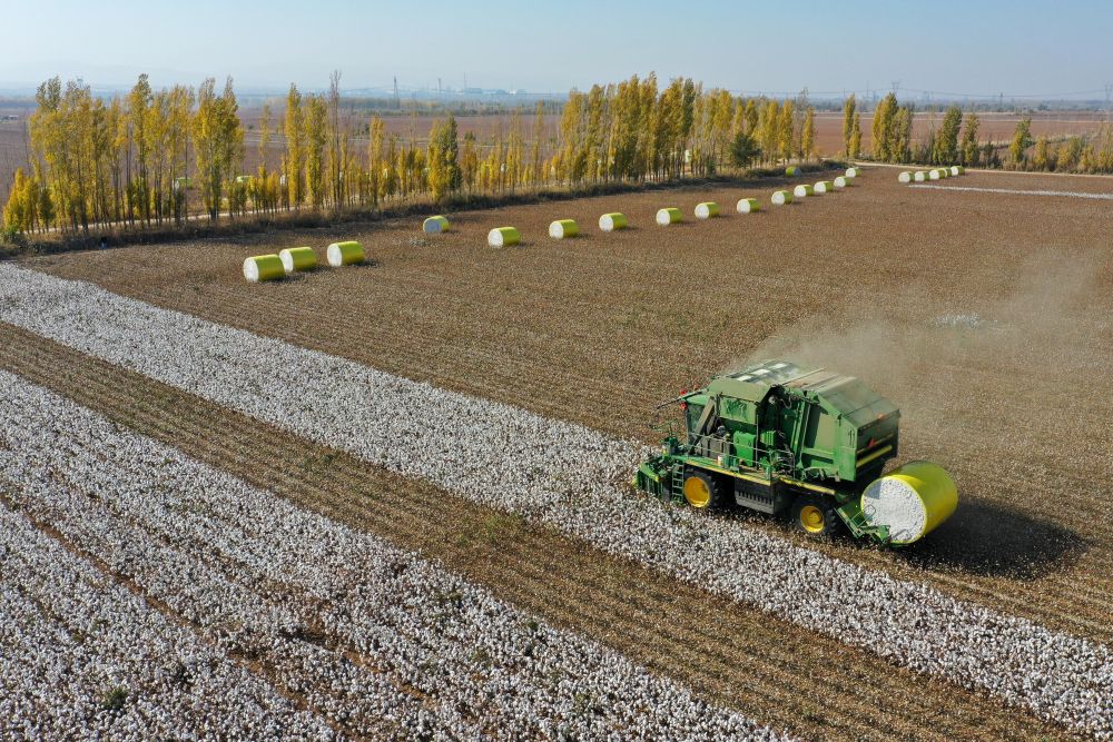 在新疆玛纳斯县乐土驿镇文家庄村,一台采棉机在棉田里采收棉花(2020年10月17日摄,无人机照片)。新华社记者 丁磊 摄