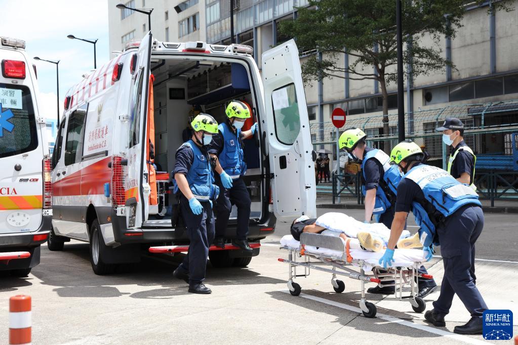 8月26日,澳门消防局人员在演习中运送受伤人员。新华社发
