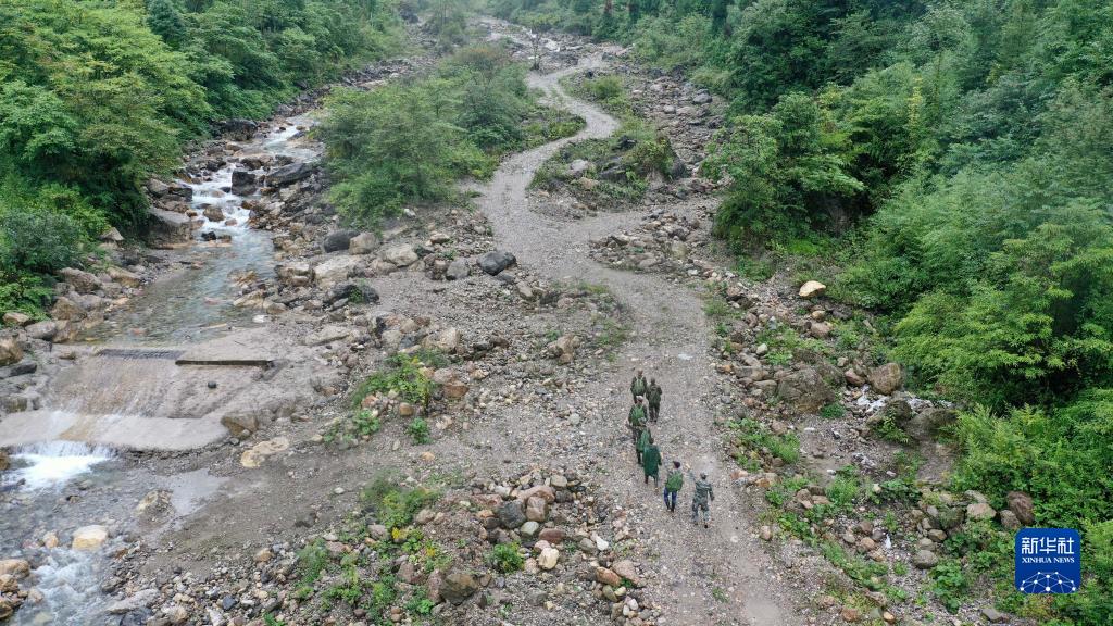 大熊猫国家公园大邑管护总站大蒜坪管护站巡护队员在巡护(8月25日摄,无人机照片)。新华社记者 萧永航 摄