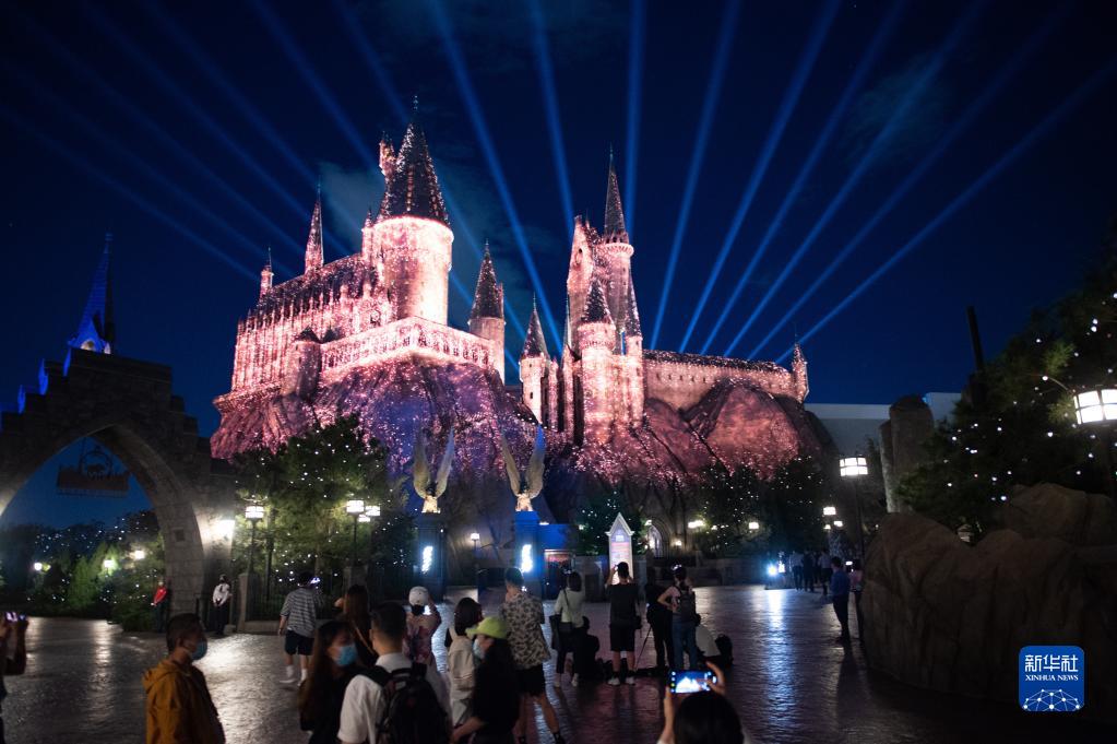 8月25日,游客在观看北京环球影城哈利·波特的魔法世界主题景区霍格沃茨城堡夜间灯光庆典表演。