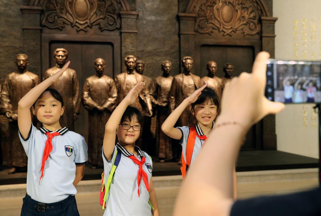 7月23日,少先队员在中共一大纪念馆内留影。(新华社记者刘颖摄)