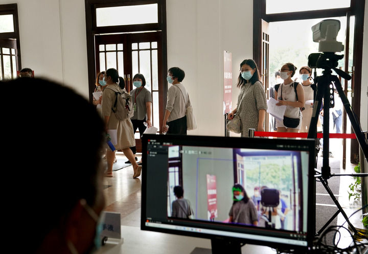 8月24日,在华东师范大学,参加演练的人员进入教学楼时接受测温。当日,华东师范大学举行2021年秋季学期开学疫情防控演练,以进一步做好开学期间校园防疫工作。新华社记者 刘颖 摄