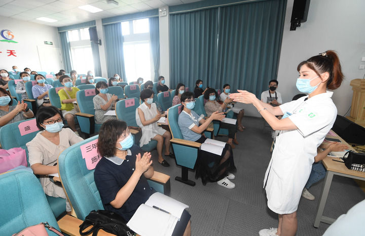 8月25日,在湖州市吴兴区龙泉街道龙泉小学,龙泉环渚卫生服务中心的医务人员给学校老师进行健康防疫培训。新华社记者 徐昱 摄
