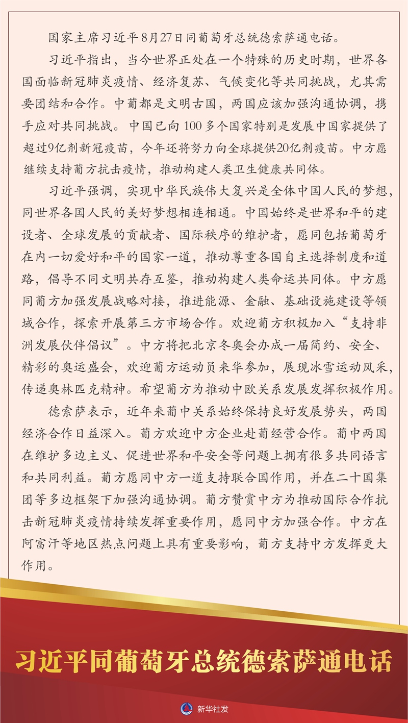 新华社北京8月27日电 国家主席习近平8月27日同葡萄牙总统德索萨通电话。