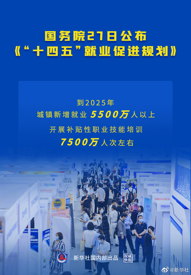 国务院27日公布的《“十四五”就业促进规划》提出,将就业优先政策置于宏观政策层面并持续强化,同时提出了健全就业目标责任考核机制、实施灵活就业人员和新就业形态劳动者支持保障计划、广泛开展新业态新商业模式从业人员技能培训、强化城镇青年就业帮扶等一系列促进高质量就业的新举措。(记者姜琳、安蓓;海报设计杨轶群 )