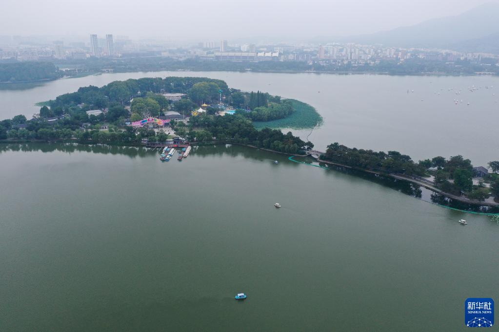 8月27日,游人乘坐游船在南京市玄武湖公园休闲放松(无人机照片)。