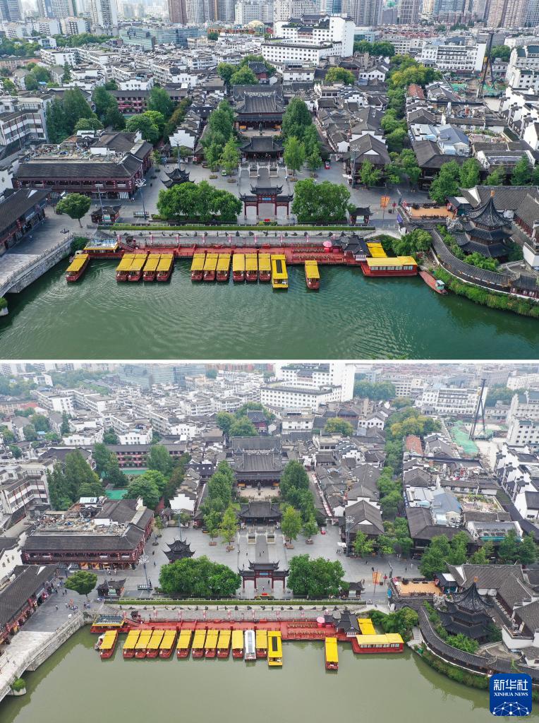 这张拼版照片显示的是:8月5日拍摄的南京夫子庙景区(上图,无人机照片);8月27日,游人在南京夫子庙景区游玩(下图,无人机照片)。