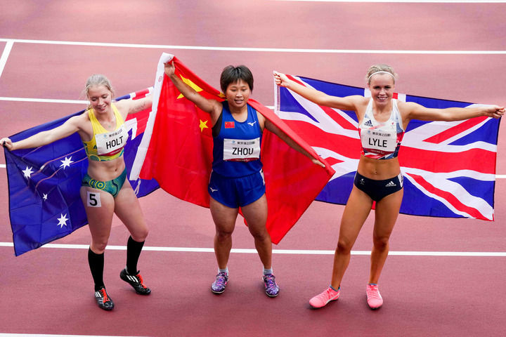 之前在里约品尝过的喜悦,五年后在东京重新上演。冲线过后,周霞立马披上五星红旗,手舞足蹈地与看台上的教练互动。在赛后混采区,周霞的那股兴奋劲儿依然“停不下来”。