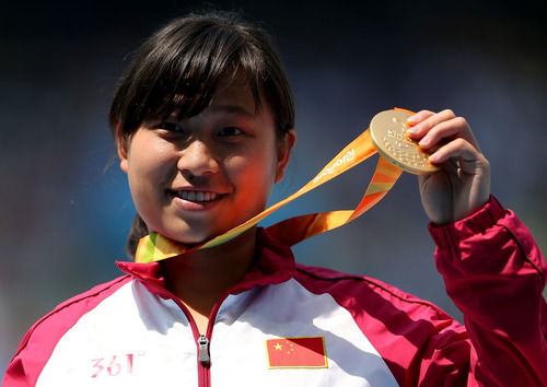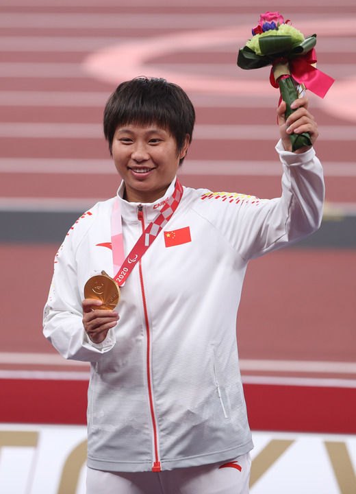 资料图:2016年9月14日,周霞在颁奖仪式上。当日,在里约残奥会田径女子100米T35级决赛中,中国选手周霞以13秒66的成绩夺得金牌。新华社记者李明摄