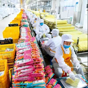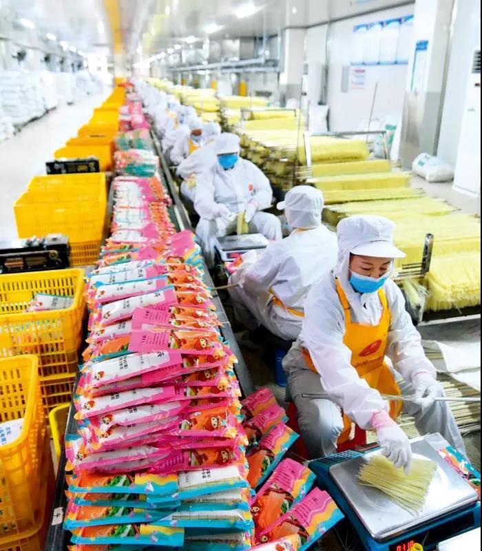 ▲ 6月5日,工人在广西柳州市乐哈哈食品科技有限公司生产车间生产线上包装米粉 黄孝邦摄/本刊