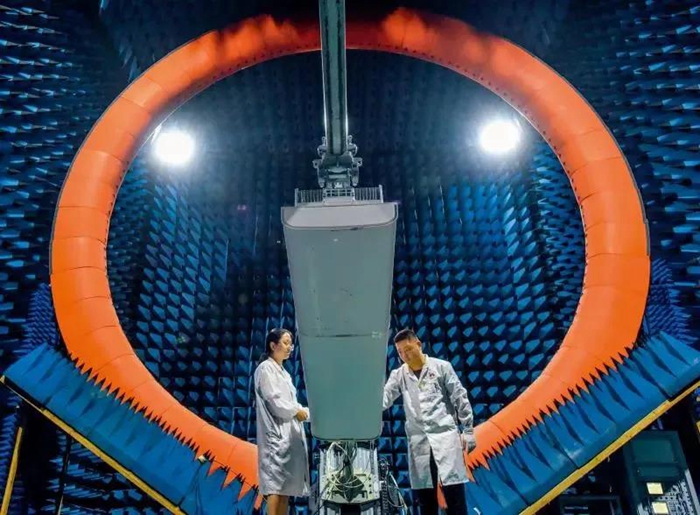 ▲ 2020年7月3日,工程师在华为实验室测试5G 基站设备 刘大伟摄/ 本刊