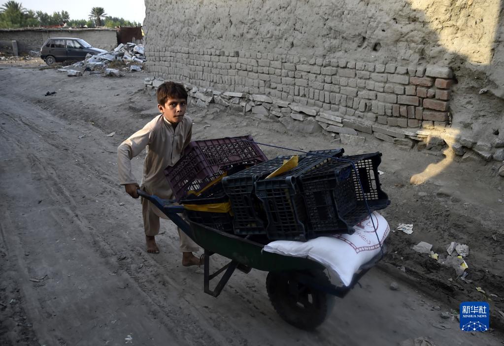 8月28日,一名阿富汗难民儿童在巴基斯坦白沙瓦的难民营推车前行。