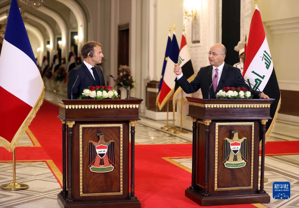 8月28日,在伊拉克首都巴格达,伊拉克总统巴尔哈姆(右)同法国总统马克龙出席新闻发布会。新华社发(哈利勒·达伍德 摄)