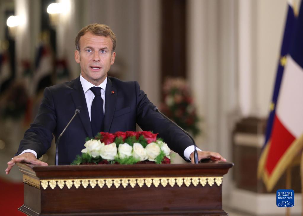8月28日,在伊拉克首都巴格达,法国总统马克龙同伊拉克总统巴尔哈姆(未在画面中)出席新闻发布会。新华社发(哈利勒·达伍德 摄)