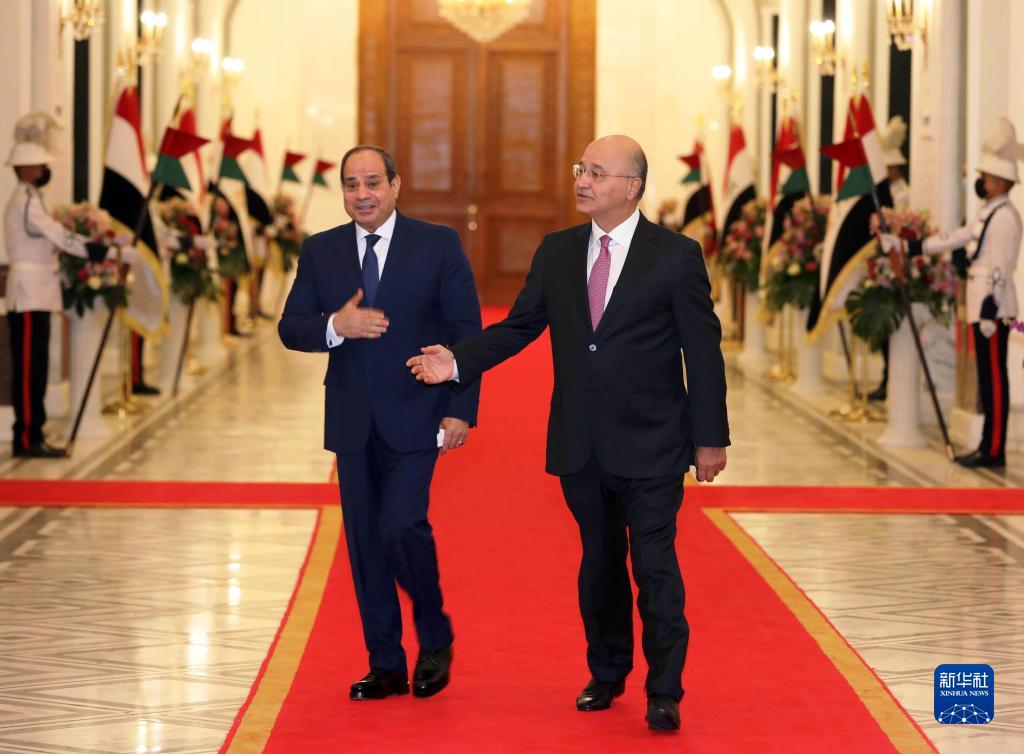 8月28日,在伊拉克首都巴格达,伊拉克总统巴尔哈姆(右)迎接埃及总统塞西。新华社发(哈利勒·达伍德 摄)