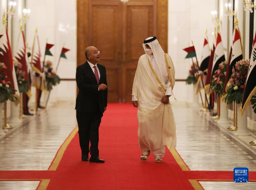 8月28日,在伊拉克首都巴格达,伊拉克总统巴尔哈姆(左)迎接卡塔尔埃米尔(国家元首)塔米姆。新华社发(哈利勒·达伍德 摄)