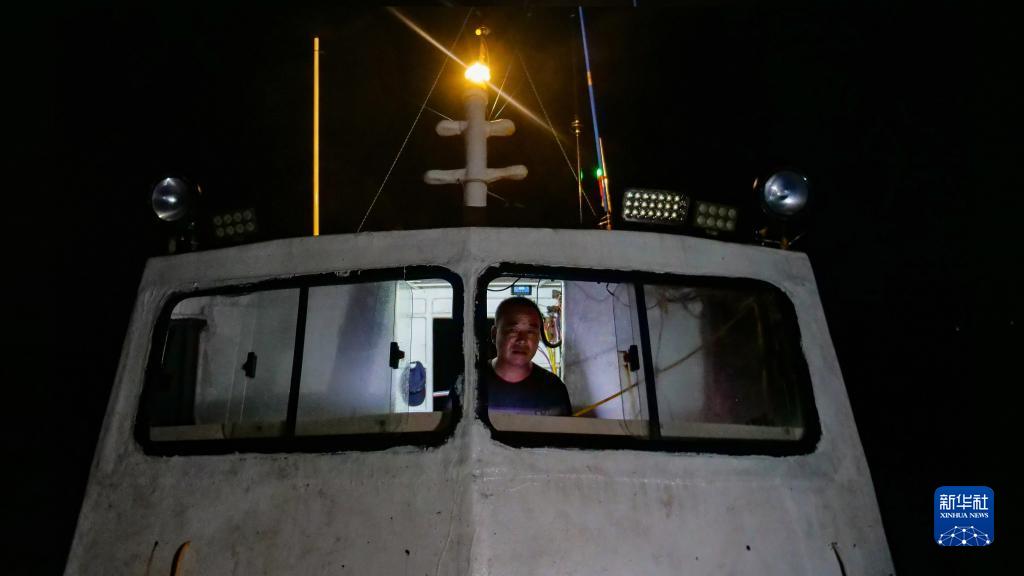 8月27日凌晨,胡国新驾驶渔船航行在海上。新华社发(周义摄)