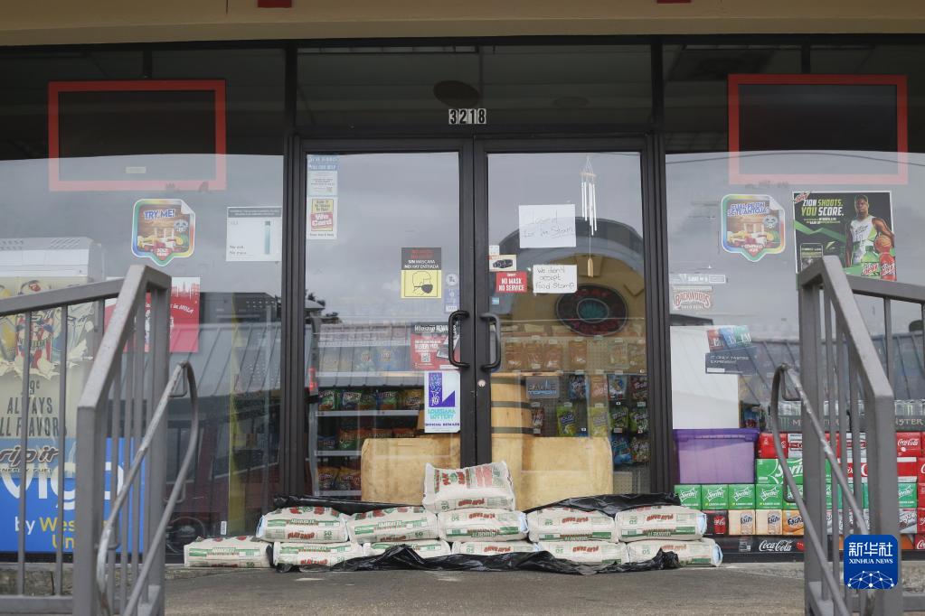 8月29日,在美国南部路易斯安那州新奥尔良市,一家超市在门口放置沙袋以抵御飓风“艾达”可能引发的洪水。当日,四级飓风“艾达”登陆路易斯安那州,最大持续风速达每小时约240公里,带来危及生命并可能引发洪水的狂风暴雨和风暴潮。 新华社发(魏兰摄)
