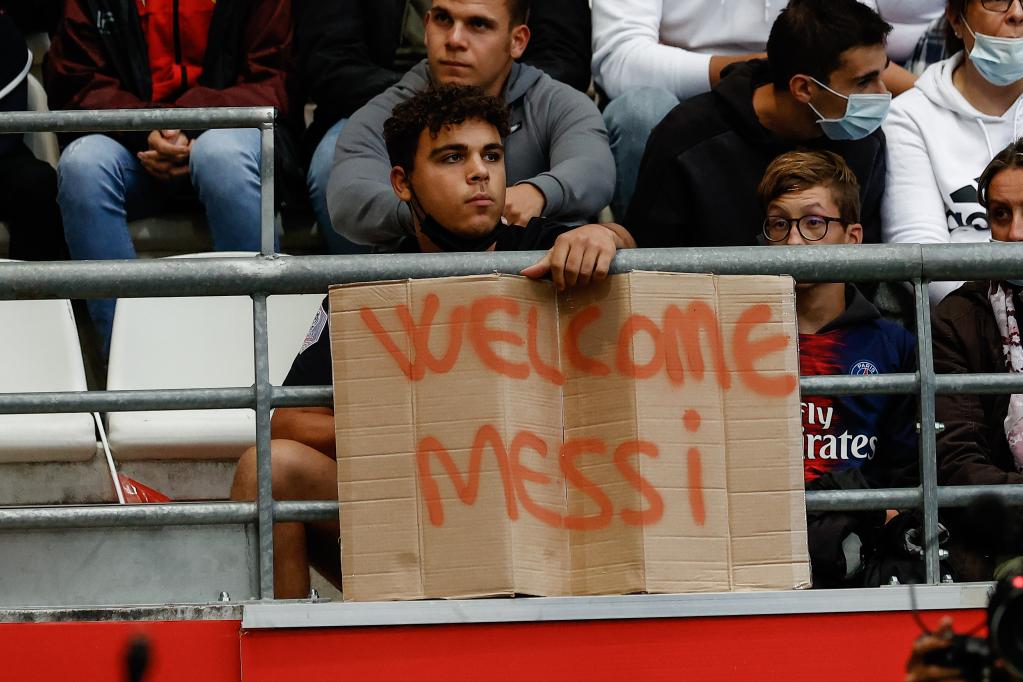 8月29日,一名巴黎圣日耳曼队球迷举着“欢迎梅西”的牌子。新华社发(奥雷利安·莫里萨尔 摄)