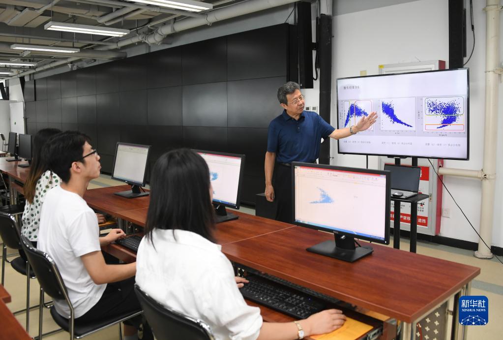 8月30日,在北京交通大学交通大数据实验室,邵春福(右)讲解数车数据分析结果。