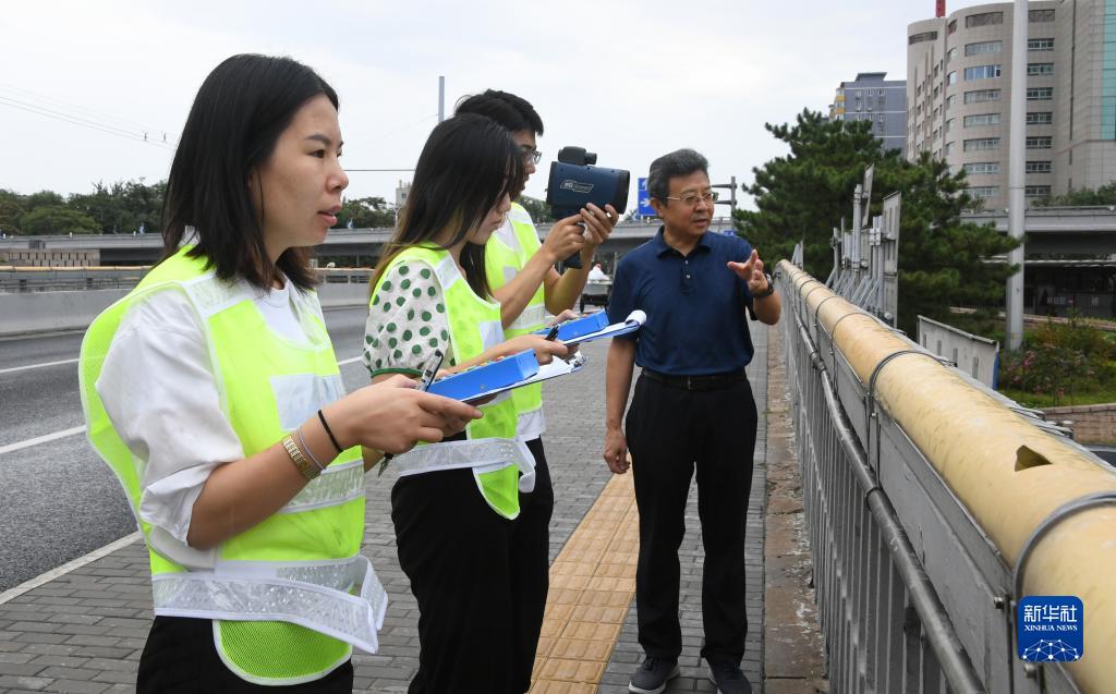 在北京西直门桥,邵春福(右一)与学生们一起数车(8月28日摄)。
