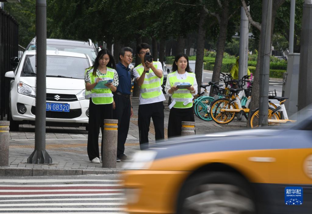 在北京交通大学西门附近的一个十字路口,邵春福(左二)与学生们一起数车(8月28日摄)。