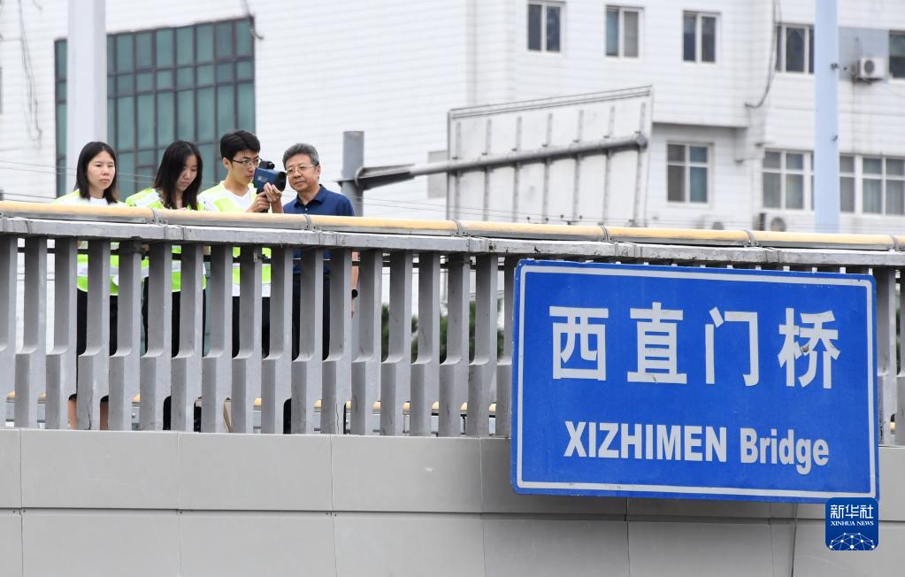 在北京西直门桥,邵春福(右一)与学生们一起数车(8月28日摄)。