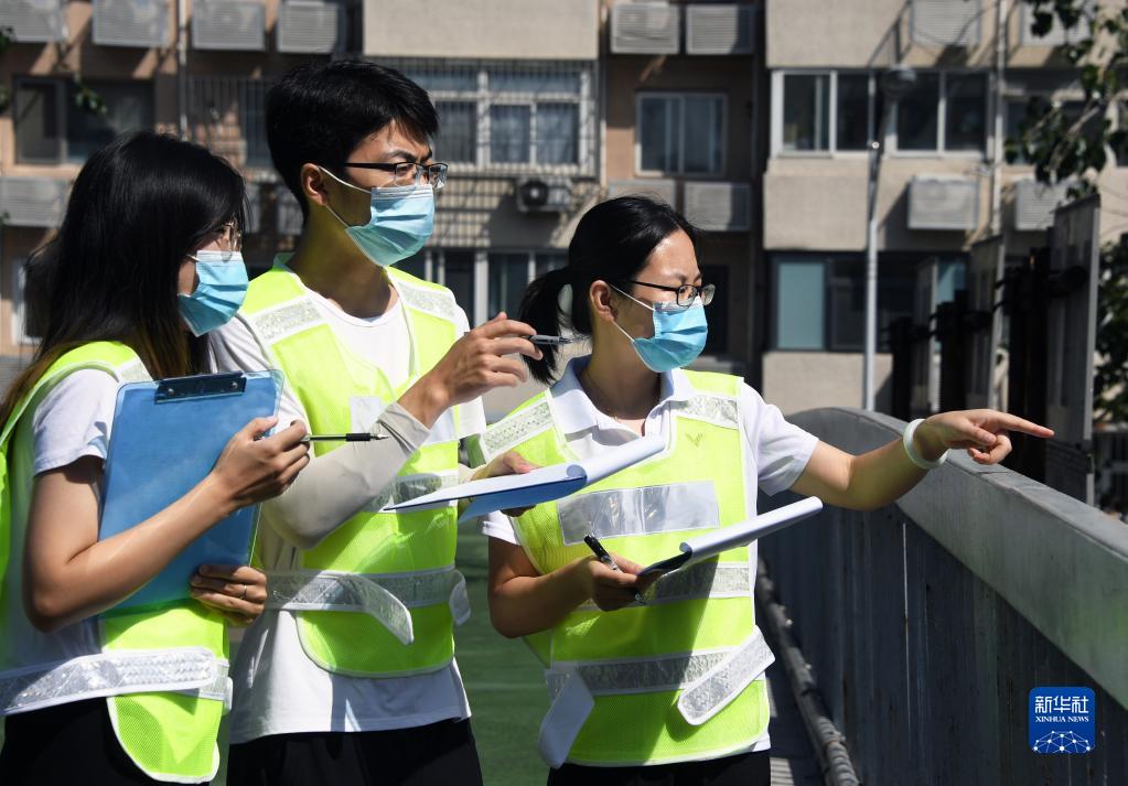 在北京市海淀区联想桥附近的一处天桥,学生们进行交通调查前的踩点工作(8月24日摄)。