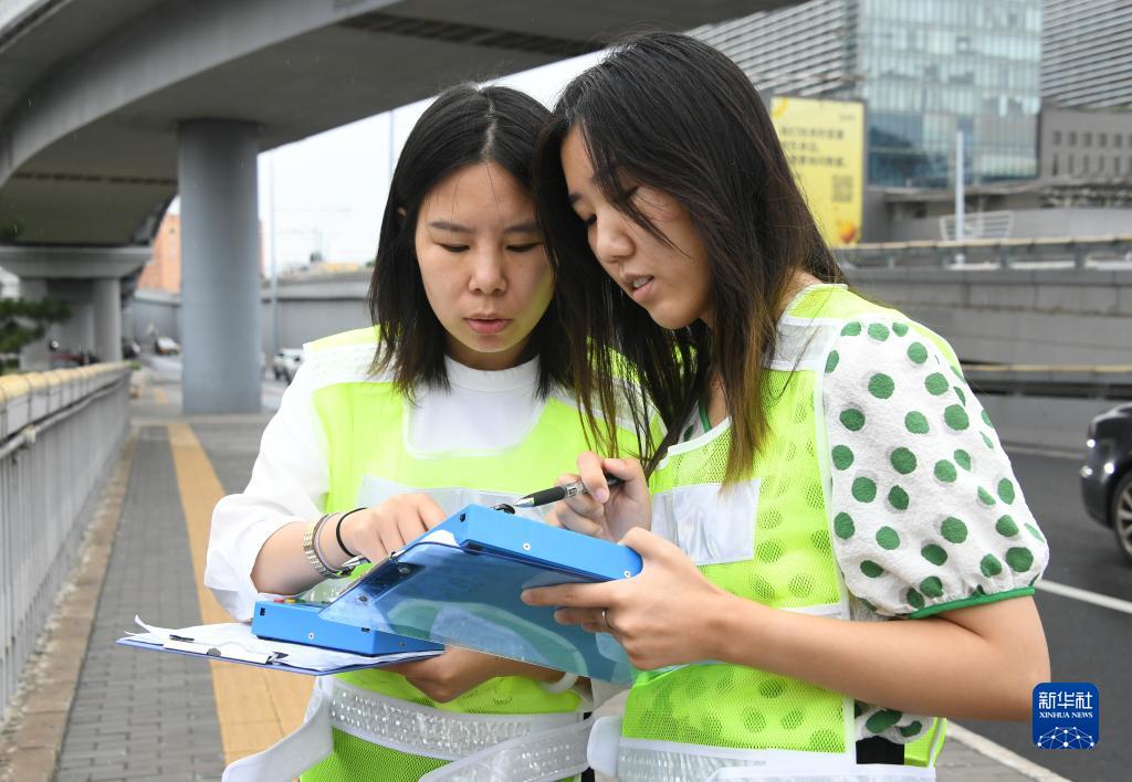 在北京西直门桥,王晟由(左)和刘晓珂在数车过程中交流(8月28日摄)。