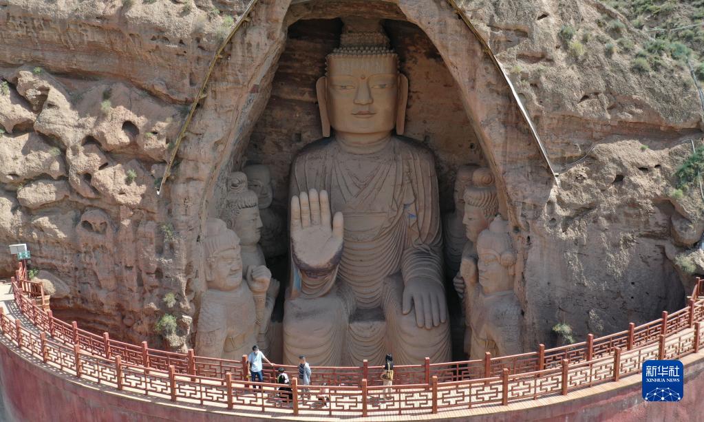 8月20日,游客在天梯山石窟第13窟参观(无人机照片)。新华社记者 杜哲宇 摄
