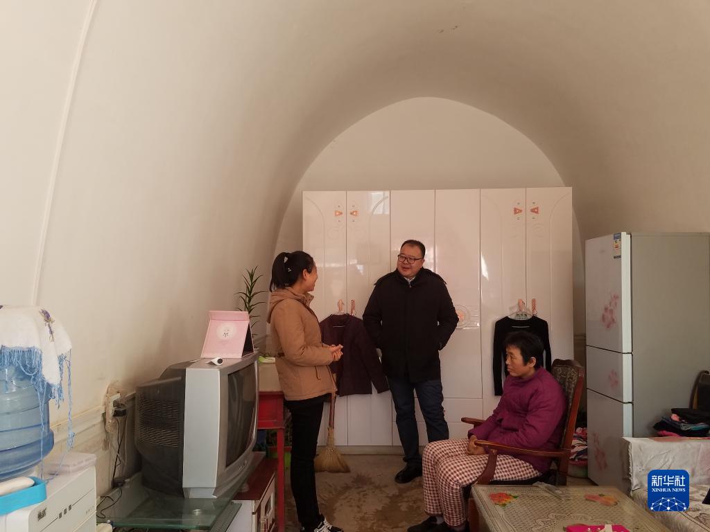 邱军(中)在城壕镇余家砭村村民燕刚家中看望其母亲与妹妹(2018年12月11日摄)。新华社发(华池县委宣传部供图)